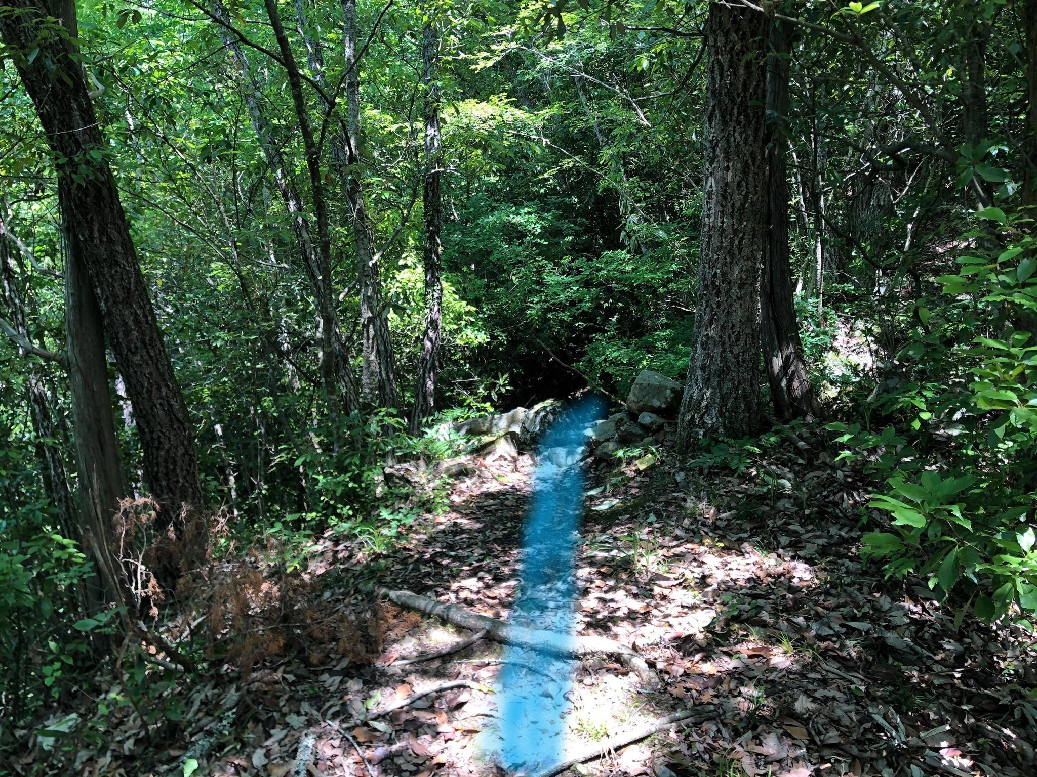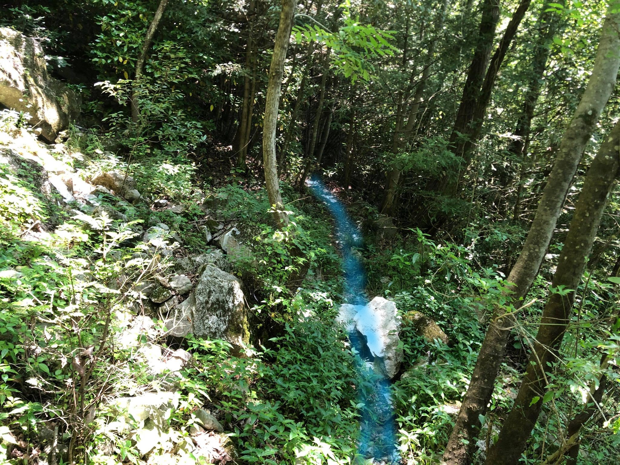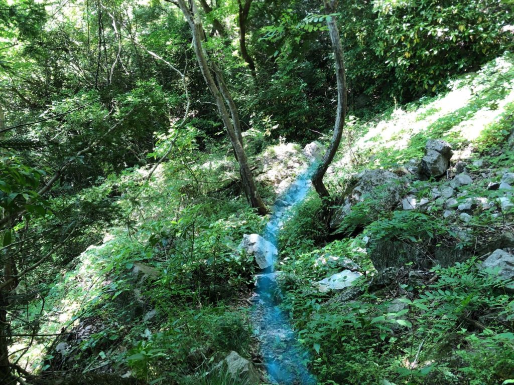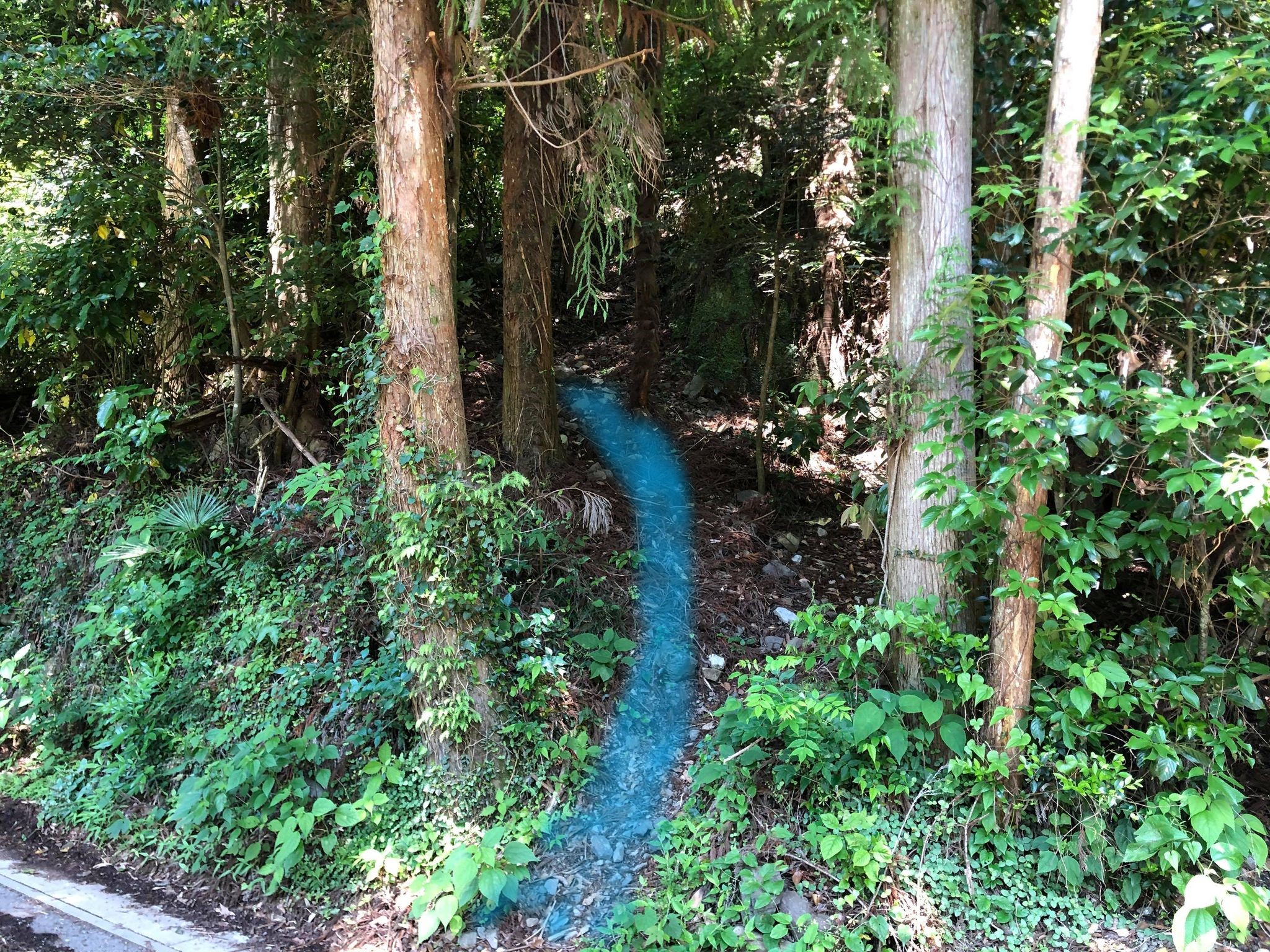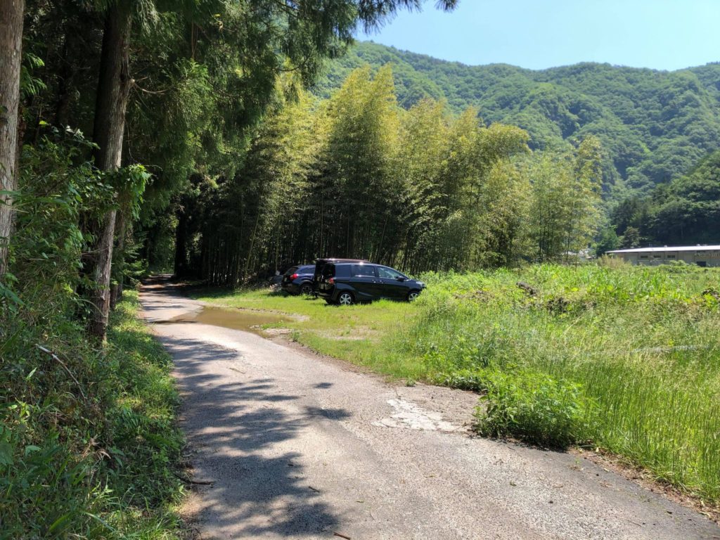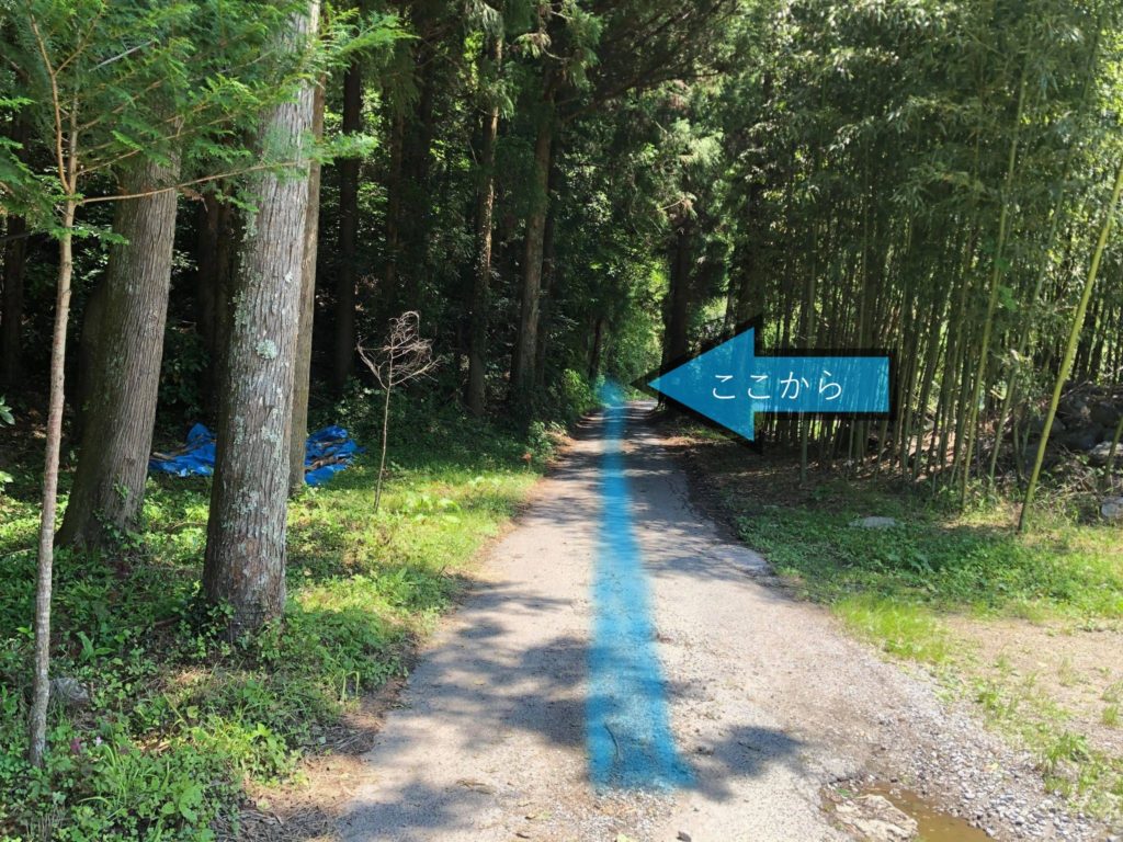 杉林を過ぎると右側に川沿いの細い道が見えます。ここまで行くと行きすぎです。