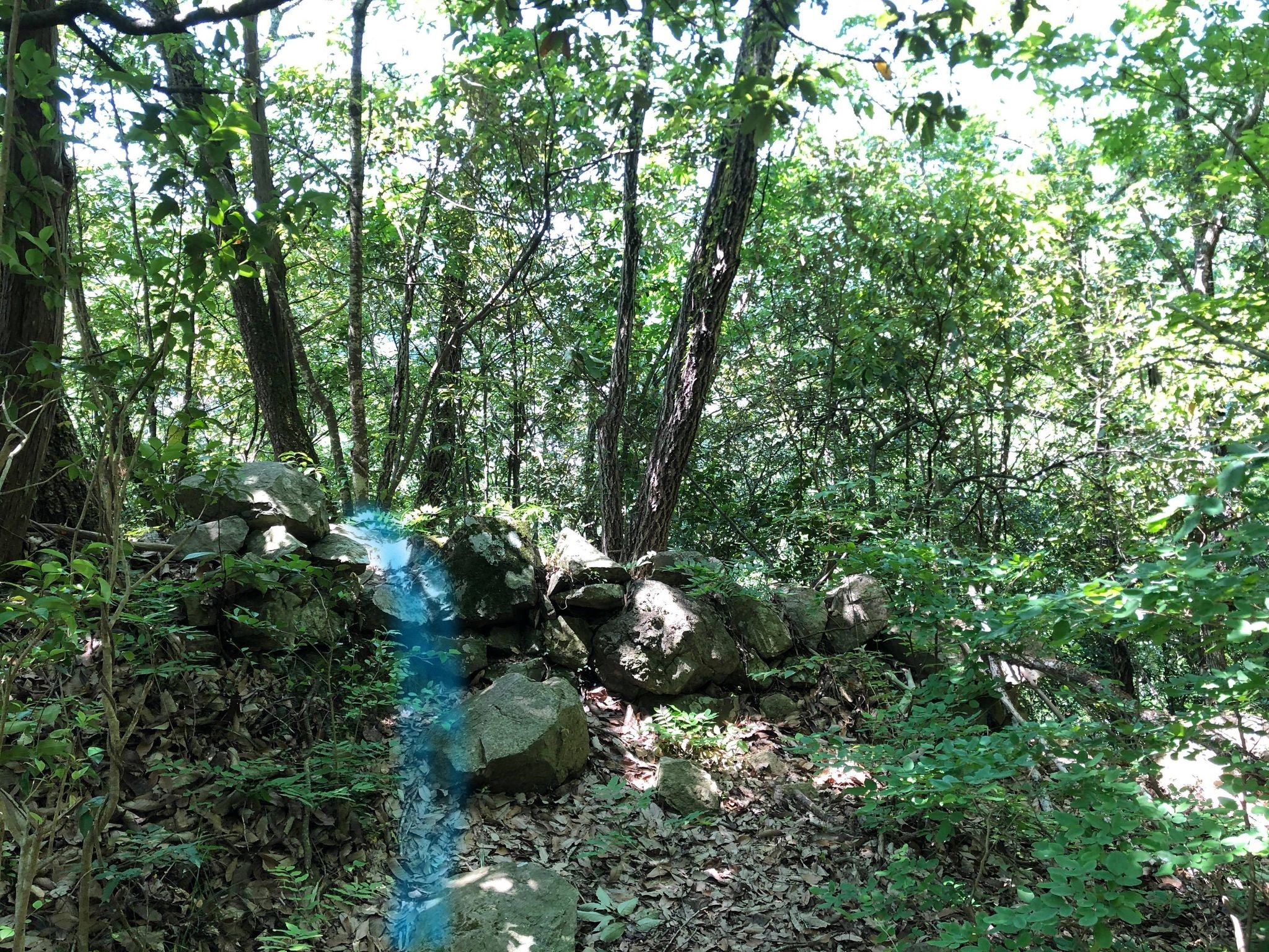 尾根に出ると、すぐ山道と交わります。山道との境に石垣があります。(少し崩れています)