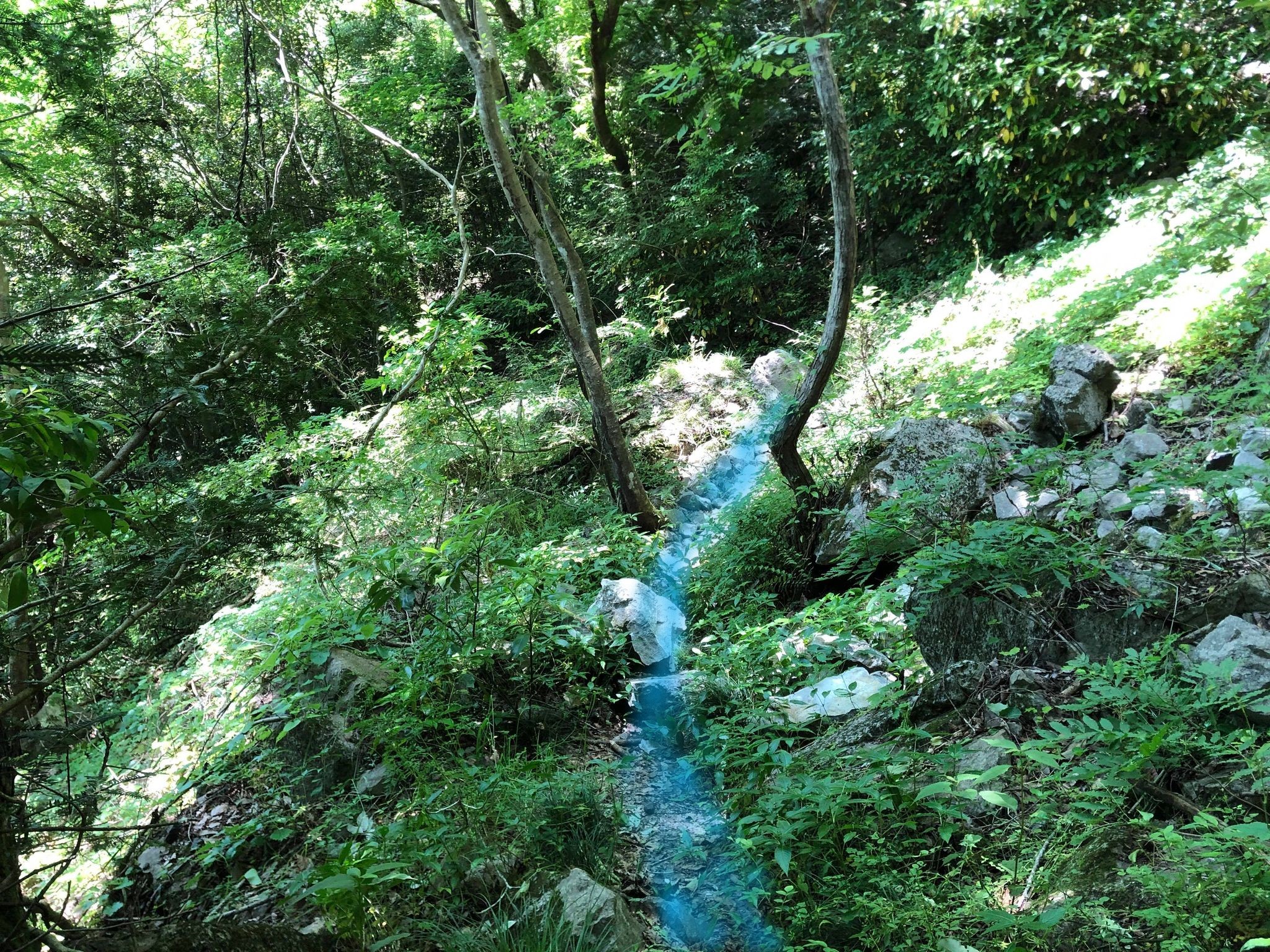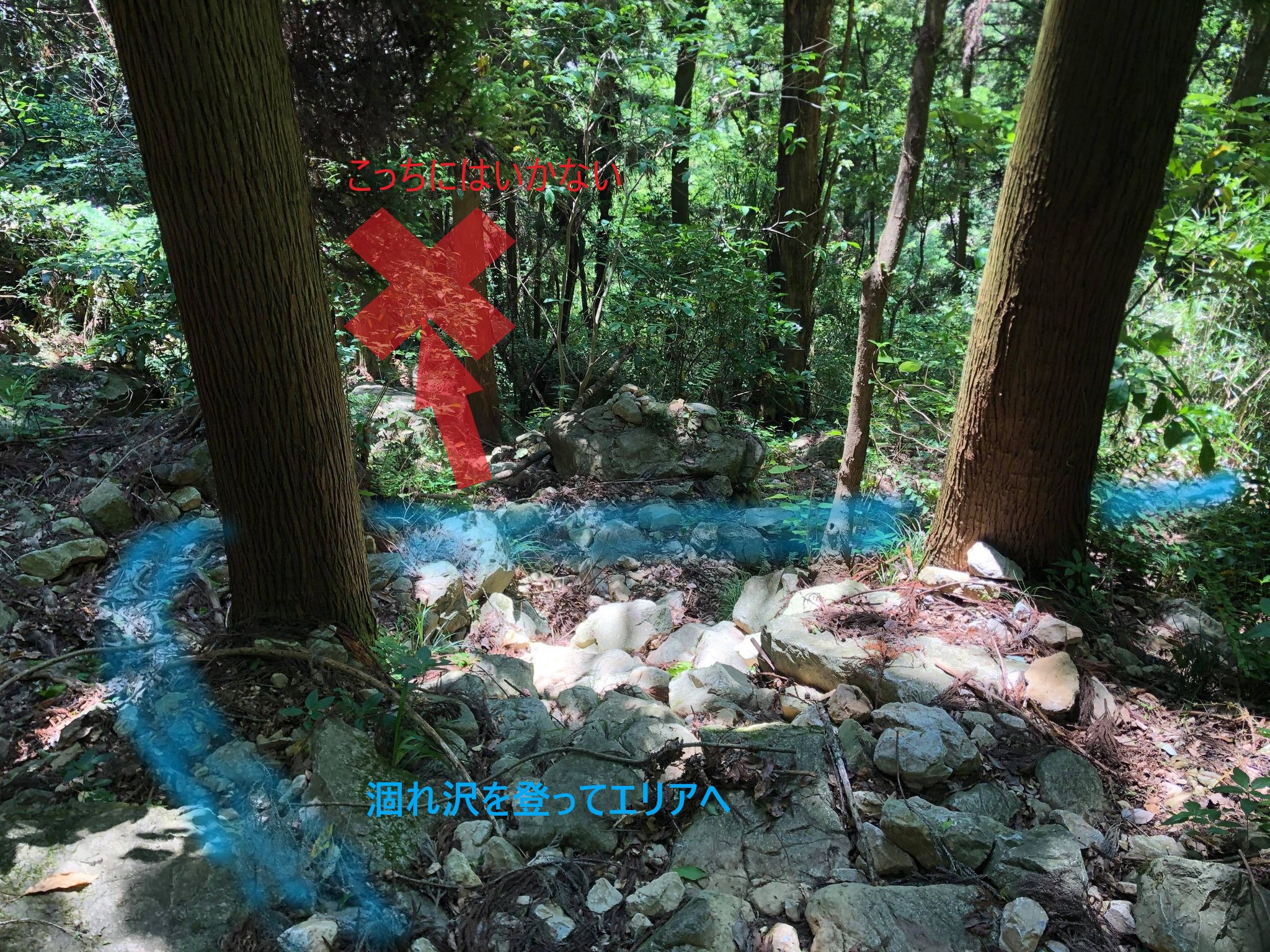 少し行くと、右下にコンクリート車道(私有地・通行禁止)が見えてきますが、そのまま歩き涸れ沢状の道に出合います(ケルンあり)。